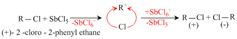 SbCl5 abstracts Cl- from the given chloro derivatiove and thus a carbocation id formed. This carbocation faces attack of Nu- from both sides, so racemises.