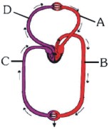 Figure shows schematic plan of blood circulation in humans with labels A to D, Identify the label and give its function/s.