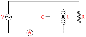 An AC source of variable frequency is connected to a capacitor C resistor R and inductor L as shown. A is an ammeter. As the frequency is steadily increased the current in A will: