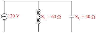 In the figure, the 60 Ω XL and 40 Ω XC are in parallel across the 120 volt source. The impedance of the circuit is:-