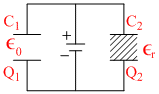 As shown in figure, two identical capacitors of values C1 and C2 are connected with a battery. Space between the plates of C1 is filled with air and that of between plates of C2 is filled with an insulator, then :−