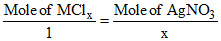 A solution containing 0.1 mol of a metal chloride MClx requires 500 ml of 0.8 M AgNO3 solution for complete reaction MClx + xAgNO3 → xAgCl + M(NO3)x. Then the value of x is