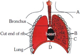 The figure shows a diagrammatic view of human respiratory system with labels A, B, C and D. Select the option which gives correct identification andmain function and/or characteristic :-