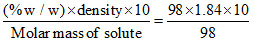 What is the molarity of H2SO4 solution that has a density 1.84 gm/cc at 35oC and contains 98% by weight-