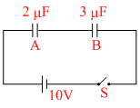 Two capacitors A and B are connected in series with a battery as shown in the figure when the switch S is closed and the two capacitors get charged fully, then