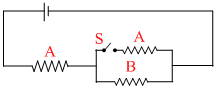 A, B, C are identical bulbs. How does the brightness of A and B change when the switch S is closed:-