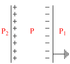 There are two metallic plates of a parallel plate capacitor. One plate is given a charge +q while the other is earthed as shown. Points P, P1 and P2 are taken as shown in adjoining figure. Then the electric intensity is not zero at :