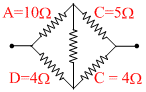 In a typical Wheatstone network the resistance in cyclic order are A = 10 Ω, B = 5 Ω, C = 4Ω and D = 4 Ω for the bridge to be balanced.