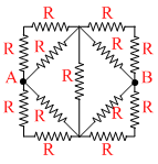 Thirteen resistance each of resistance R ohm are connected in the circuit as shown in the figure. The effective resistance between A and B is : -