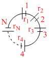 A group of N cells whose emf varies directly with the internal resistance as per the equation EN = 1.5 rN are connected as shown in the figure. The current I in the circuit is