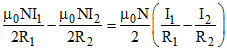 Two concentric coils of 10 turns each are situated in the same plane. The radii are 20 cm and 40 cm and they carry respectively 0.2 and 0.3 ampere current in opposite directions. The magnetic field at the centre is :-