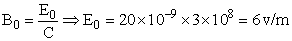 The magnetic field in a travelling electromagnetic wave has a peak value of 20nT. The peak value of electric field strength is :