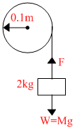 The moment of inertia of a solid flywheel about its axis is 0.1 kg-m2. A tangential force of 2kg wt. is applied round the circumference of the flywheel with the help of a string and mass arrangement as shown in the figure. If the radius of the wheel is 0.1m, find the acceleration of the mass :-