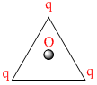 Three equal charges are placed at the three corners of an equilateral triangle as shown in the figure. The statement which is true for E and V (usual notation) at the centre is -