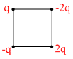 As shown in figure four charges are placed at the corners of a square. If the side of square is 5 cm in length and the value of q is 1 μC, the electric field intensity at the centre of square will be :-