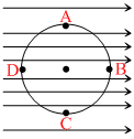 A circle of radius R is drawn in a uniform electric field E as shown in the fig. VA, VB, VC and VD are respectively the potential of point A, B, C and D at the periphery of the circle then