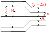 Fig. shows field lines of an electric field, the line spacing parallel to the page is same every where. If the magnitude of the field at A is 40 N/C, then the magnitude of the field at B is approximately