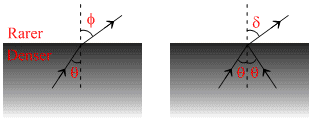 When the ray passes into the rarer medium, the deviation is δ = φ - 0. .This can have a maximum value of