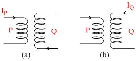 In fig. (a) and fig. (b) two air-cored solenoids P and Q have been shown. They are placed near each other. In fig. (a), when IP, the current in P, changes at the rate of 5 As-1, an emf of 2 mV is induced in Q. The current in P is then switched off, and a current changing at 2 A s-1 is fed through Q as shown in diagram. What emf will be induced in P:-