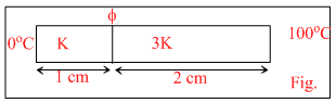 Two bars of thermal conductivities K and 3K and lengths 1 cm and 2 cm respectively have equal cross-sectional area. they are joined lengths wise as shown in the figure. If the temperature at the ends of this composite bar is 0oC and 100oC respectively (see figure), then the temperature of the interface (φ) is