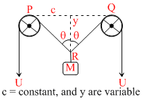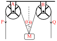In the arrangement shown in the figure the ends P and Q of an unstale string move downwards with uniform speed U. Pully A and B are fixed. Mass M moves upwards with a speed
