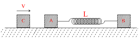 Two blocks A and B each of mass m, are connected by a massless spring of natural length L and spring constant k. The block initially resting on a smooth horizontal floor with the spring at its natural length, as shown in figure. A third identical block C, also of mass m move on the floor with a speed v along the joining A and B, and collides elastically with A. Then