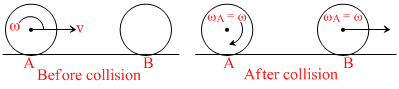 A smooth sphere A is moving on a frictionless horizontal plane with angular velocity ω and centre of mass velocity v. It collides elastically and head on with an identical sphere B at rest. Neglect friction every where. After the collision their angular speed are ωA and ωB respectively. Then,