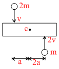 A nuniform bar of length 6a and mass 8 m lies on a smooth horizontal table. Two points masses m and 2m moving in the same horizontal plane with speed 2v and v respectively, strike the bar [as shoen in the figure] and stick to the bar after collision. Denoting angular velocity (about the centre of the mass), total energy and centre of mass velocity by ω, E and vc respectively, we have after collision.