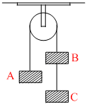 Three equal weights of mass 2 kg each are hanging on a string passing over a fixed pulley as shown in fig. What is the tension in the string connecting weights B and C.