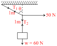 A mass of 6 kg is suspended by a rope of length 2m from a celling. A force of 50 N is applied in horizontal direction at the mid point of the rope. What is the angle of the rope with the verticle in equilibrium :-