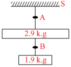 Two blocks of masses 2.9 kg. and 1.9 kg. are suspended from a rigid supports by two inextensible wires each of length, 1m. the upper wire has negligible mass and the lower wire has a uniform mass of 0.2 kg./m. the whole system of block, wire and support have an upward acceleration of 0.2 m/sec2 (g = 9.8 m/sec2). The tension at the mid-point of lower wire is