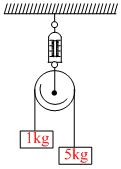 Two masses of 1 kg and 5 kg are attached to the ends of a massless string passing over a pulley of negligible weight. The pulley itself is attached to a light spring balance as shown in figure. The masses start moving during this interval; the reading of spring balance will be:-