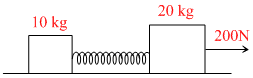 Two masses of 10 kg and 20 kg respectively are connected by a massless spring as shown in the figure. A force of 200 N acts on the 20 kg mass. At the instant shown the 10 kg mass has acceleration 12 m/s2. What is the acceleration of 20 kg mass :-
