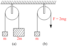 The pulley arrangements shown in the figure are identical, the mass of the rope being negligible. In case (a) mass m is lifted by attaching a mass of 2m to the other end of the rope. In case (b) the mass m is lifted by pulling the other end of the rope with a constant downward force F = 2mg, where g is the acceleration due to gravity. The acceleration of mass m in case (a) is :-