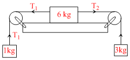 Three masses of 1 kg, 6 kg and 3 kg are connected to each other with threads and are placed on a table as shown in figure. What is the acceleration with which the system is moving ? Take g = 10 ms-2 :