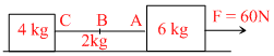 Two blocks of masses 6 kg and 4 kg are connected by a rope of mass 2 kg are resting on a frictionless floor as shown in the following figure :