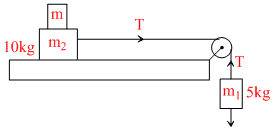 Two masses m2 = 10 kg and m1 = 5kg are connected by a string passing over a pulley as shown. If the coefficient of friction be 0.15, then the minimum weight that may be placed on m2 to stop motion is :-