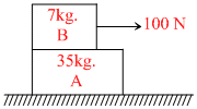 Block A of mass 35 kg is resting on a frictionless floor. Another block B of mass 7 kg is resting on it as shown in the figure. The coefficient of friction between the blocks is 0.5 while kinetic friction is 0.4. If a horizontal force of 100 N. is applied to block B, the acceleration of the block A will be (g = 10 ms-2)