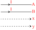 A and B are two wire carrying a current I in the same direction. x and y are two electron beams moving in the same direction. There will be :-