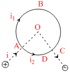 A circular conducting loop is connected by a battery according to figure. The length of ABC and ADC is l1 and l2 respectively then which is correct :-