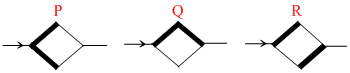 Two thick wires and two thin wires, all of the same materials and same length form a square in the three different ways P, Q and R as shown in figure with current connection shown. The magnetic field at the centre of the square is zero in cases :-