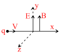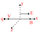 A particle of charge q and mass m is moving along the x-axis with a velocity v and enters a region of electric field E and magnetic field B as shown in figure beolw. For which figure the net force on the charge may be zero :-
