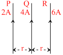 P, Q and R long parallel straight wires in air, carrying currents as shown. The direction of resultant force on R