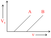 The stopping potential as a function of frequency of incident radiation is plotted for two different surfaces A and B. The graphs show that the work function of A is