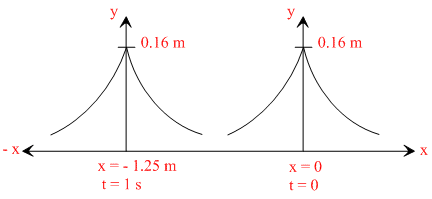 value of y is again 0.16 m, i.e., pulse has travelled a distance of 1.25 m in 1 s in negative x-direction or we can say that he speed of pulse is 1.25 m/s and it is travelling in negative x-direction. Therefore, it will travel a distance of 2.5 m in 2 s. The above statement can be better understood from figure (b).