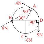 A wheel of radius 20 cm has force applied to it as shown in the fig. The torque produced by the forces 4N at A, 8N at B, 6N at C, 9N at D at angles indicated is : -