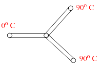 Three rods made of the same material and having the same cross-section been joined as shown in the figure. Each rod is of the same length. The left and right ends are kept at 0o C and 90o C respectively. The temperature of junction of the three rods will be