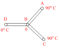 Let θ be the temperature of the junction (say B). Thermal resistanceof all the three rods is equal. Rate of heat flow through AB+ Rate of heat flow through CB = rate of heat flow through BD