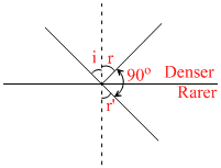 A ray of light from a denser medium strikes a rarer medium at an angle of incidence i (see figure). The reflected and refracted rays make an angle of 90o with each other. The angles of reflection and refrection are r and r′. The critical angle is