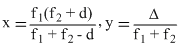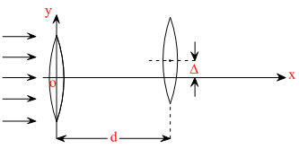 Taking the origin of coordinates, O, at the centre of the first lense, x and y -coordinates of the focal point of this lense system, for a parallel beam of rays coming from the left, are given by